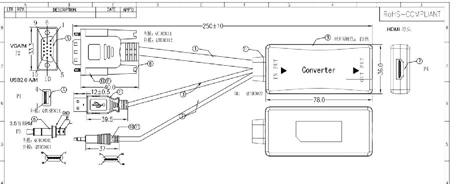 الموصل: مدخلات واحدة VGA، واحد إدخال الصوت، واحد إدخال USB، واحد خرج HDMI.